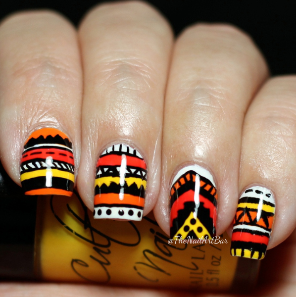 J'ai tout d'abord appliqué 3 couches de Cult Nails Tempest, puis j'ai dessiné des lignes (ou des chevrons dans le cas de mon accent nail) avec les 3 couleurs du mois, mentionnées au dessus. J'étais tellement effrayée à l'idée de ruiner complètement ma manucure avec mon top coat, qu'au lieu d'utiliser un vernis noir, j'ai utilisé de l'encre de Chine pour créer mes motifs Aztèques :P