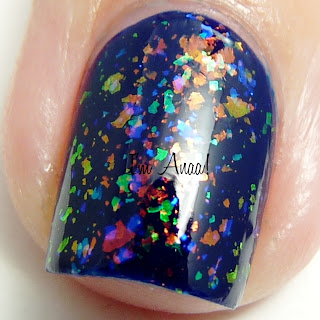 Clairvoyant, previously released under the name Unicorn Puke, is a blue jelly with vivid blue, red/rust and green flakies. I used one coat over Time Traveler for the pic, and one of top coat. Pictures taken in my light box to minimize the annoying light reflections.